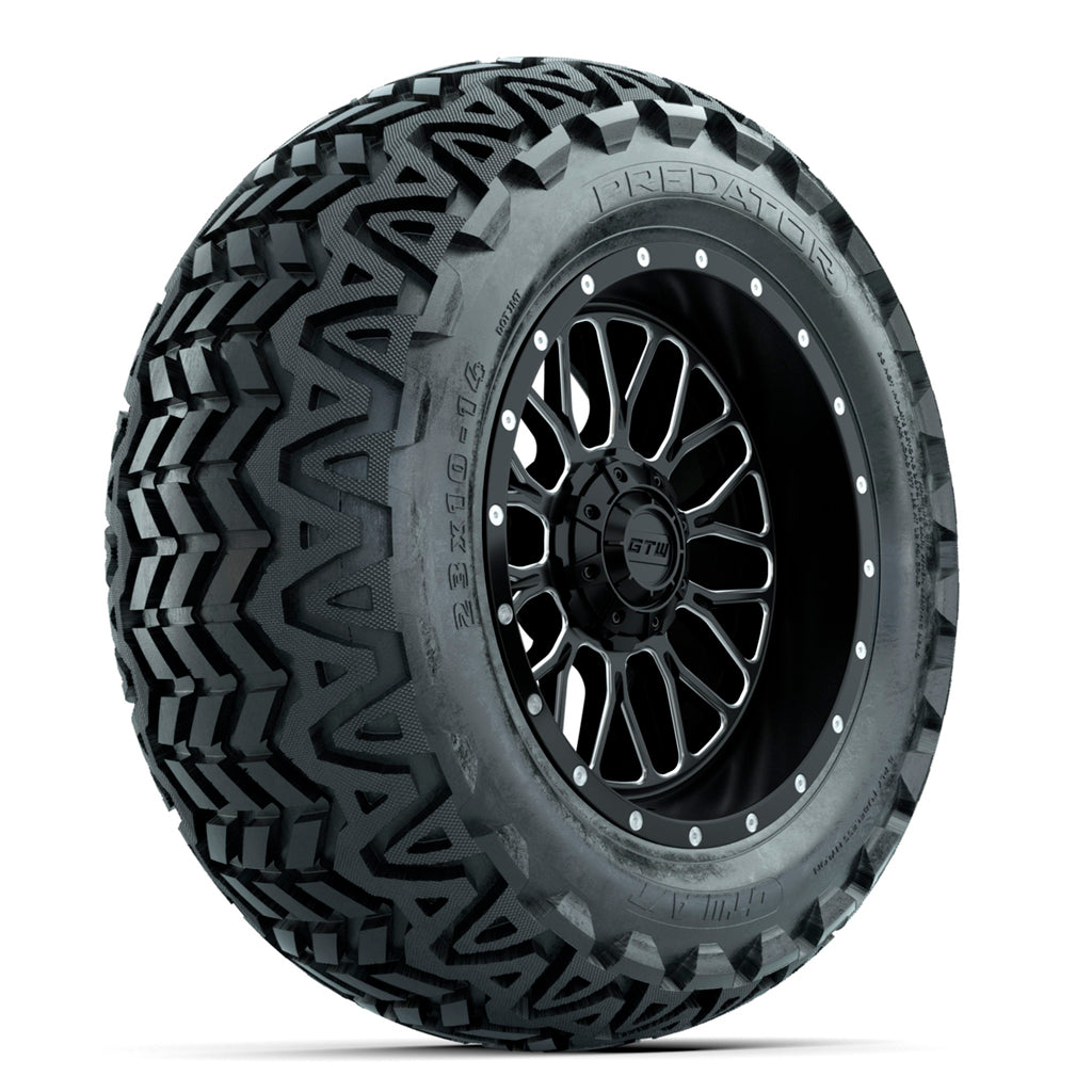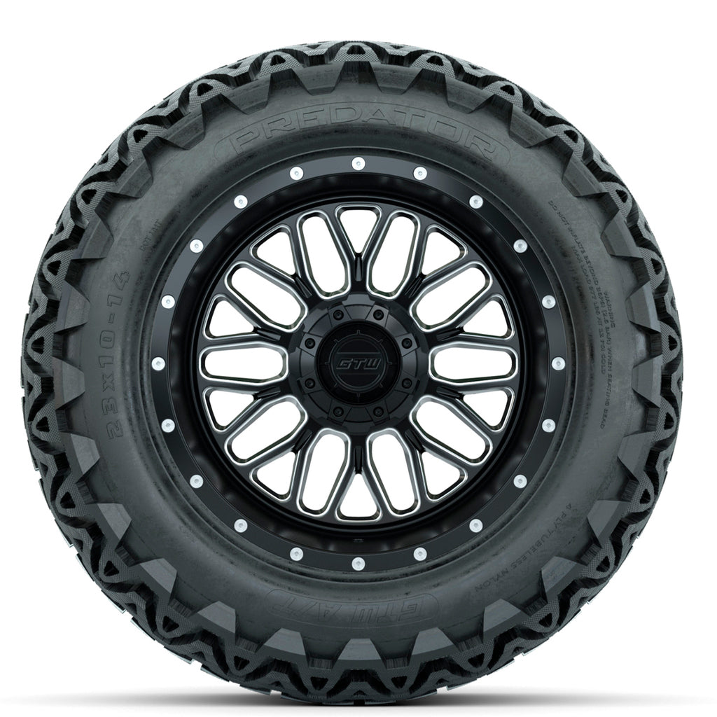Un juego de (4) caras mecanizadas GTW® Helix de 14 pulgadas con ruedas negras para carrito de golf montadas en neumáticos todo terreno GTW® Predator de 23x10-14